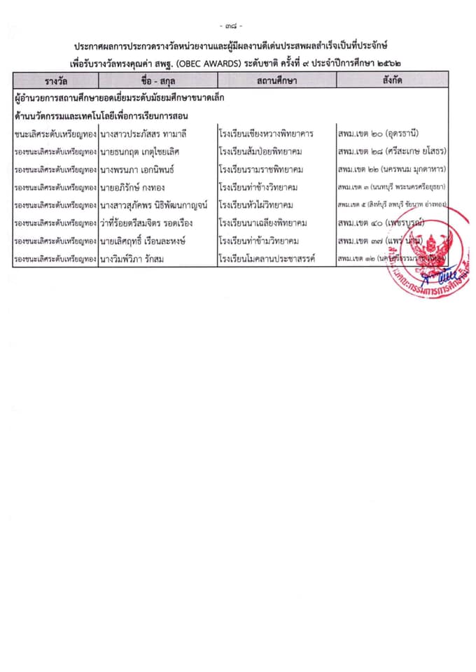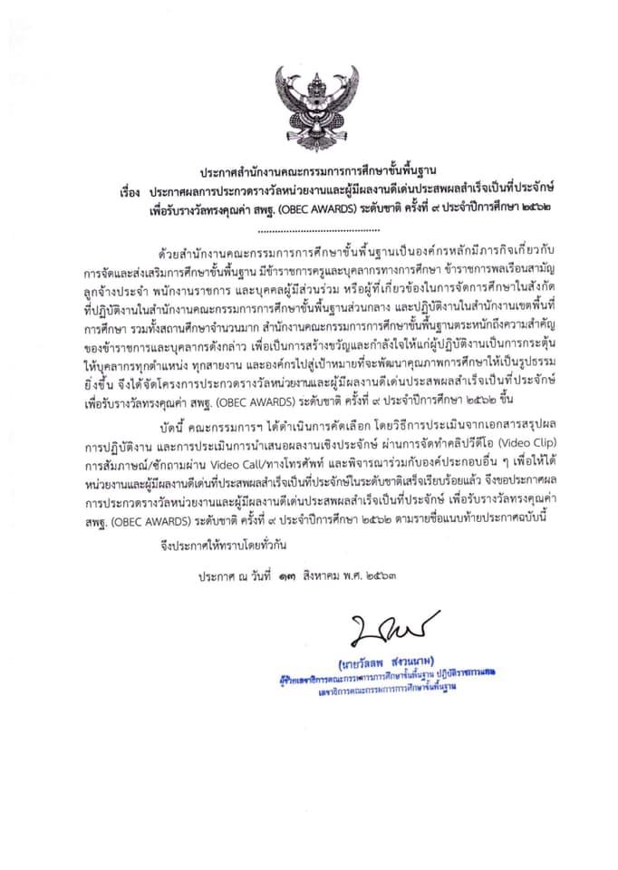ผลการประกวดรางวัลหน่วยงานและผู้มีผลงานดีเด่นประสพผลสำเร็จเป็นประจักษ์ เพื่อรับรางวัลทรงคุณค่า สพฐ. (OBEC AWARDS) ระดับชาติ ครั้งที่ 9 ประจำปีการศึกษา 2562
