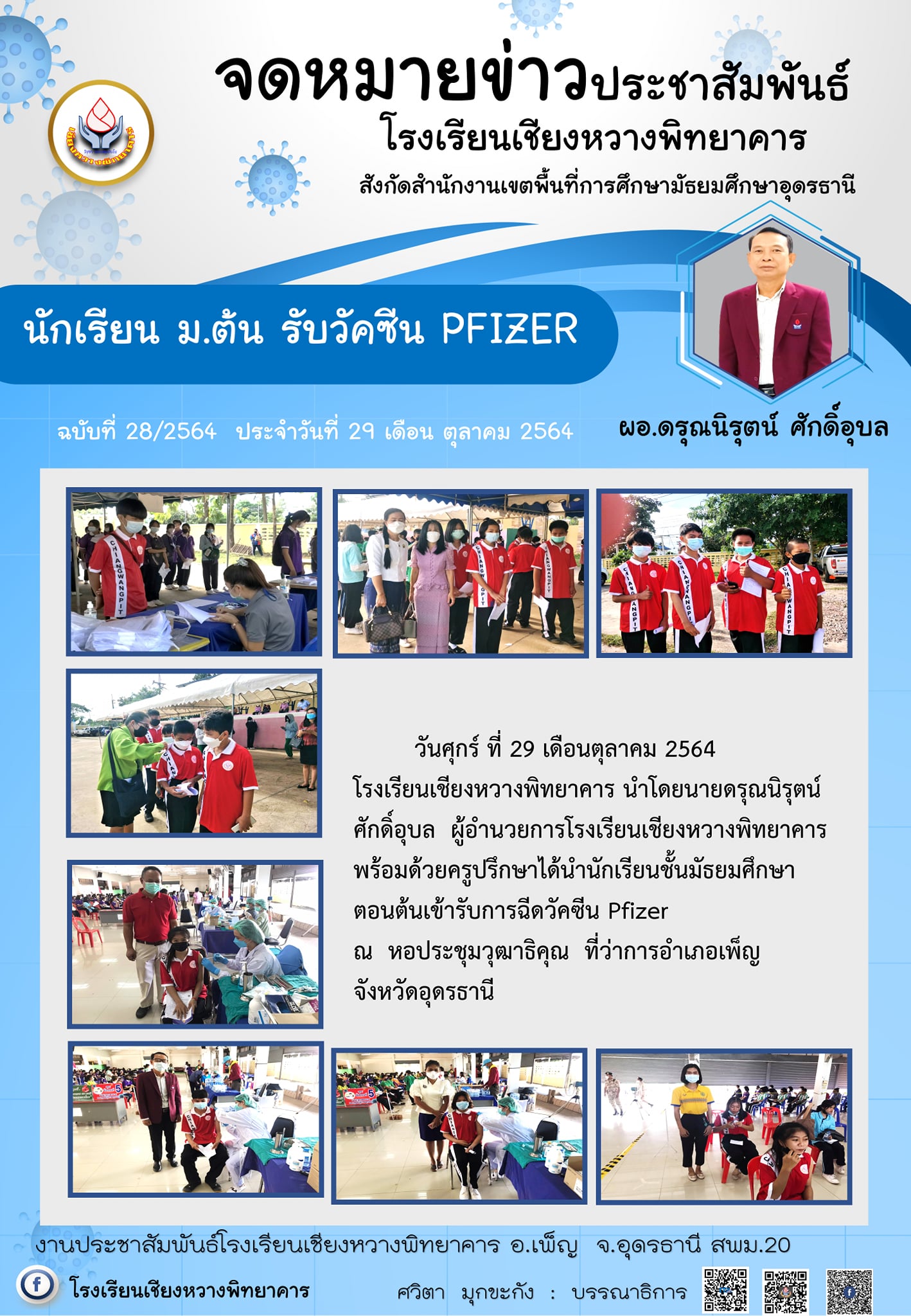 นักเรียนชั้นมัธยมศึกษาตอนต้น โรงเรียนเชียงหวางพิทยาคาร เข้ารับการฉีดวัคซีนป้องกันโรคติดต่อเชื้อไวรัสโคโรน่า 2019 ณ หอประชุมวุฒาธิคุณ ที่ว่าการอำเภอเพ็ญ จังหวัดอุดรธานี